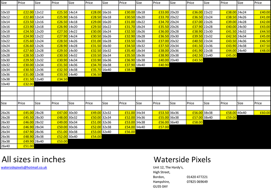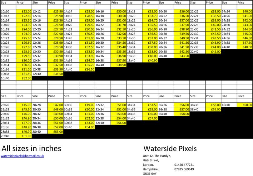 Waterside Pixels offers a canvas printing service ranging across a variety of sizes. I can take your photo, whether it's digital or printed, new or old, and print it onto a framed canvas ready for you to collect at your convience. The whole process takes just a matter of days and makes for a unique gift for a friend or relative, or even yourself. The price list below covers most of the avaliable sizes, but for anything else please contact me and I can advise you on anything you need to know. Gift vouchers are also avaliable for however much you are willing to spend.